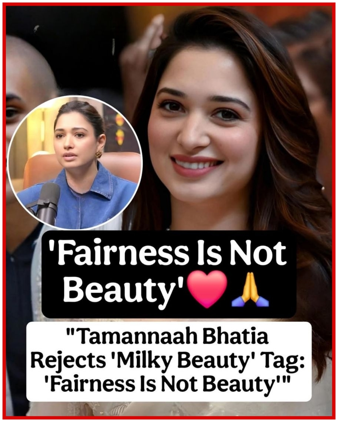 Tamannaah stated, “Fairness is not beauty,” highlighting her discomfort with compliments based only on her fair skin and advocating for a broader definition of beauty.